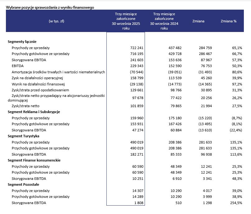 W trzecim kwartale 2025 roku Wirtualna Polska Holding S.A. osiągnęła 716,1 mln złotych przychodów gotówkowych ze sprzedaży, co oznacza wzrost o prawie 67% w porównaniu do analogicznego okresu ubiegłego roku. Skorygowana EBITDA Grupy wyniosła 241,6 mln złotych, rosnąc o 57% rok do roku. Głównym motorem tego dynamicznego wzrostu pozostaje segment turystyki, wzmocniony niedawnymi akwizycjami w tym obszarze.